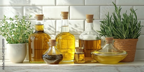 Variety of Glass Bottles with Different Vegetable Oils and Fats Surrounded by Fresh Herbs on a Bright Kitchen Counter