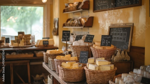 Various cheeses displayed on rustic counter in traditional cheese shop
