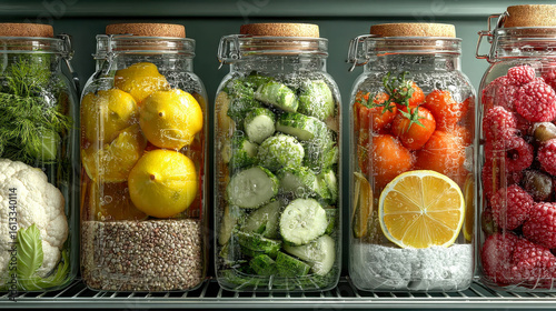 Various fresh fruits and vegetables preserved in glass jars inside a refrigerator