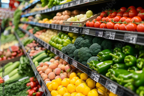 Various kinds of fresh vegetables are neatly arranged on supermarket shelves. Generative AI