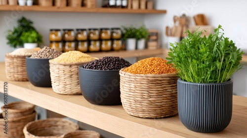 Various legumes displayed on counter in wicker baskets and black bowls with green plant