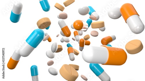 Various medicine and pills on white background.