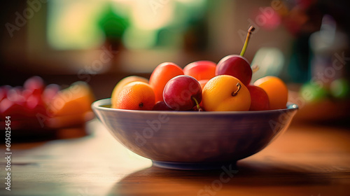 Vase with fresh fruits stands on a wooden table against a blurred background, creating a favorable atmosphere. Generative AI