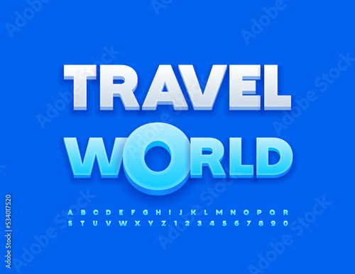 Vector bright poster Travel World. Blue 3D Font. Modern Alphabet Letters and Numbers