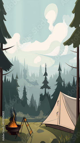 Vector camping tent in the forest.Summer camp with bonfire, tent, backpack . cartoon landscape with mountain, forest and campsite.