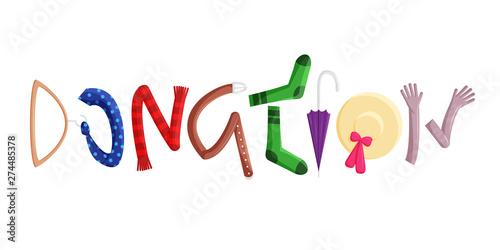 Vector Illustration of Donation Clothes in Flat Style. Word Concept. Word Donation Consists of Colorful Letters in the Form of Different Items of Clothing. Lettering of Accessories