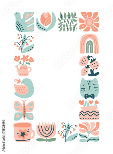 Vector spring ethnic logo composition pattern frame tile mosaic of bird, flower, leaf, strawberry and branch. Cute boho illustration in hand drawn constructor for scandinavian greeting card