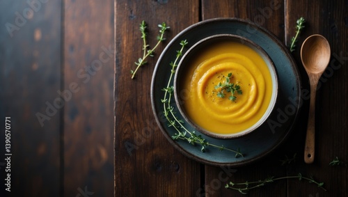 Vegetable puree soup on a dark wooden surface. Pumpkin cream soup with thyme. Dish presentation. Vegetarian cuisine. Vegan food. Dark aesthetic.