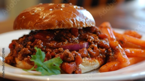 Vegetarian Sloppy Joes. Close-up of a sloppy joe sandwich with savory meat filling