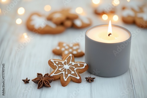 Vela acesa em recipiente cinza ao lado de biscoitos natalinos de gengibre e anis estrelado sobre mesa branca com luzes desfocadas ao fundo, IA generativa