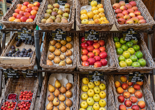 Vendor counter with colorful fruits , apple