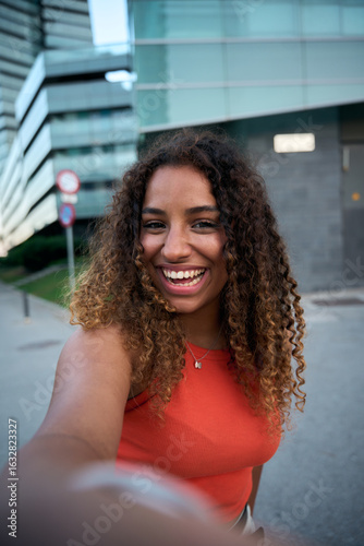 Vertical. Trendy young woman with curly hair and vibrant smile standing in a modern city street, ideal for social media, youth fashion, or lifestyle branding visuals.