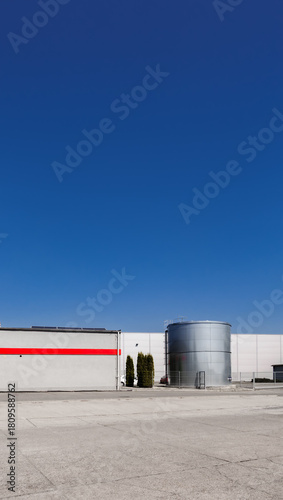 Vertical View of Steel Industrial Storage Tank and Warehouse Building Against Deep Blue Sky. Modern Factory Infrastructure in Gniezno Poland