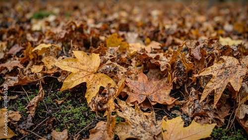 Vibrant autumn leaves covering forest floor with moss peeking through