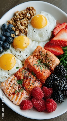 Vibrant breakfast bowl with salmon, eggs, berries, and granola