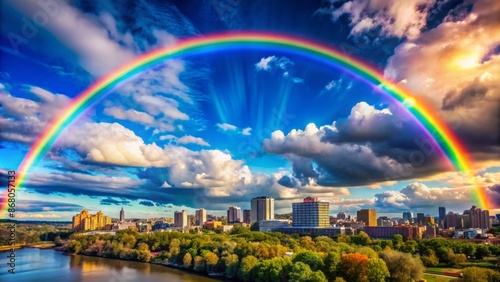 Vibrant colorful arching rainbow stretches across clear blue sky with soft white puffy clouds and subtle cityscape in background.