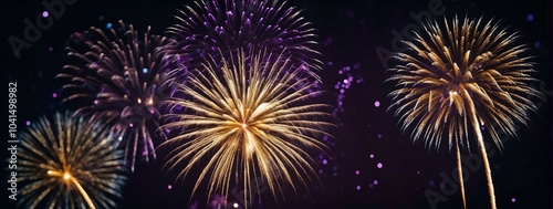 Vibrant gold and dark violet fireworks illuminate the night sky for New Year celebrations