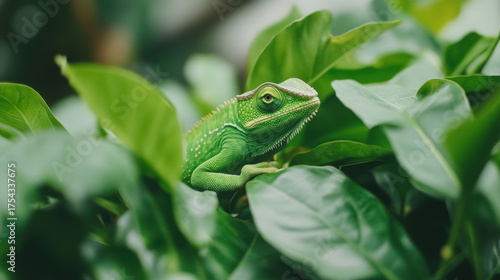 Vibrant green chameleon camouflages among lush tropical leaves, showcasing its unique texture and color. scene captures beauty of nature and intricate relationship between wildlife and foliage