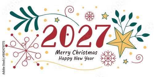 Vibrant Holiday Greeting Card – Merry Christmas & Happy New Year 2027 with Stars, Snowflakes & Swirls