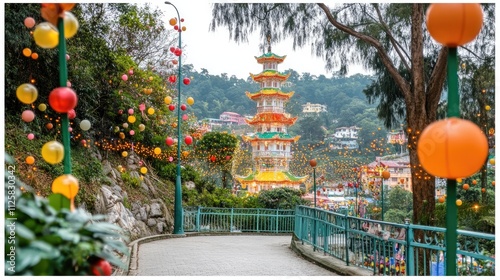 Vibrant Lanterns and Pagoda in Scenic Park Setting During Festival