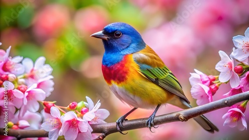 Vibrant Painted Bunting on Cherry Blossom Branch
