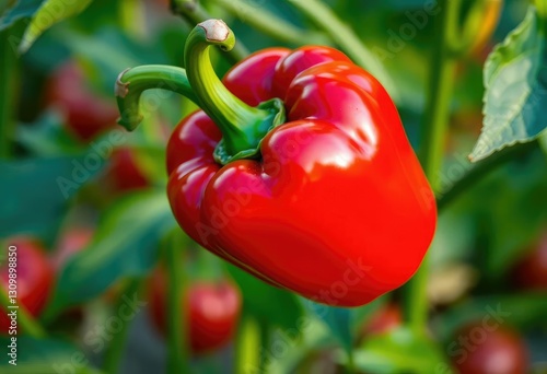 Vibrant red bell pepper, glossy skin, stem intact, ripe, plant