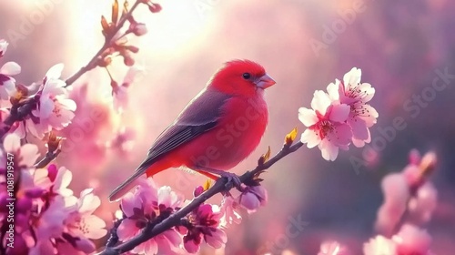 Vibrant Red Bird Perched Among Beautiful Cherry Blossom Flowers in Soft Focus, Illuminated by Gentle Natural Light, Creating a Dreamy Spring Atmosphere