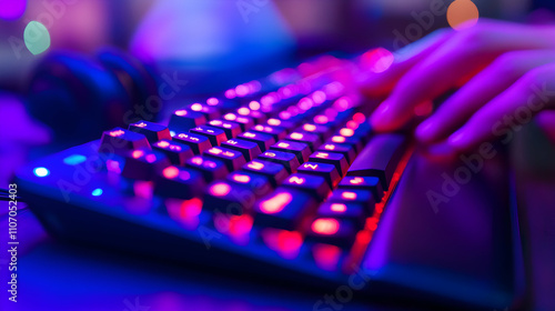 Vibrant RGB Keyboard, Close-up of Illuminated Keys, Gamer's Hands Typing Rapidly in Neon Light
