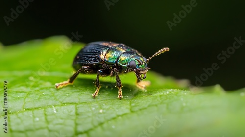 Vibrant Shiny Green Beetle on Leaf Closeup in Natural Habitat : Generative AI