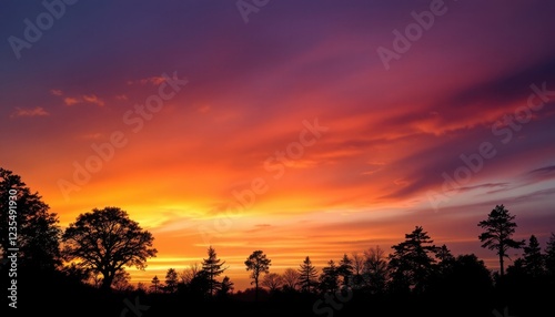 Vibrant sunset with silhouetted trees and dramatic sky colors