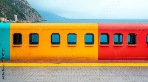 Vibrant train car stands at coastal station with colorful exterior in a scenic location