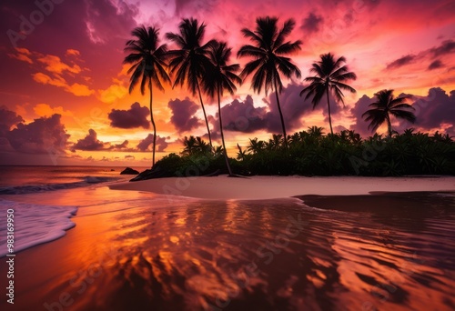 vibrant tropical landscape showcasing stunning sunset silhouetted dancing palm trees colorful sky, beach, horizon, nature, scenery, evening, beauty, light