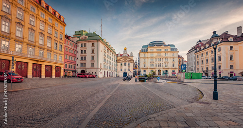 Vienna, Austria - October 20, 2024: Panoramic view of Am Hoff square with Vienna Municipal Fire Station. Beautiful autumn sunrise in Vienna city, Capital of Austria, Europe.