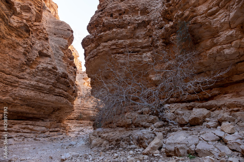 View inside a deep dry canyon in a remote desert region. High walls of a narrow canyon of wadi Hava with a withered tree inside. Hiking trail in a heart of the desert.