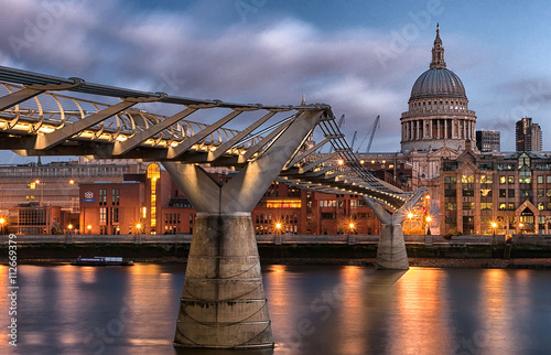 View of St Paul's Cathedral church and Millennium Bridge at night