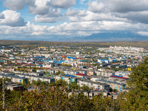 View of the city of Petropavlovsk-Kamchatsky from Mishennaya Sopka. Magnificent views of the city and home volcanoes from above. Kamchatka Peninsula, Russia.