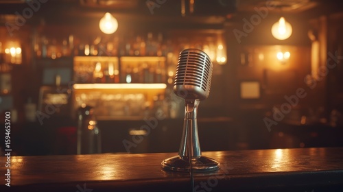 Vintage microphone on bar counter in dimly lit jazz bar.