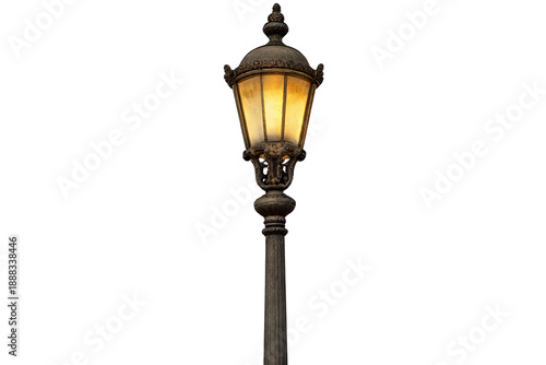 Vintage street lamp with ornate ironwork and lit glass shade, featuring classic design elements for outdoor urban illumination.