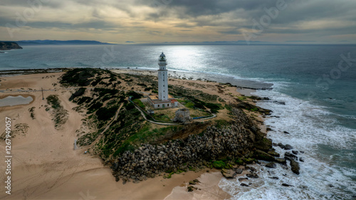 vista aérea del amanecer en el tómbolo de Trafalgar, Andalucía