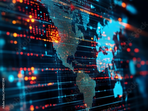 Visual of a digital interface showing economic policy scenarios with outcomes projected on a global scale, concept of predictive ec