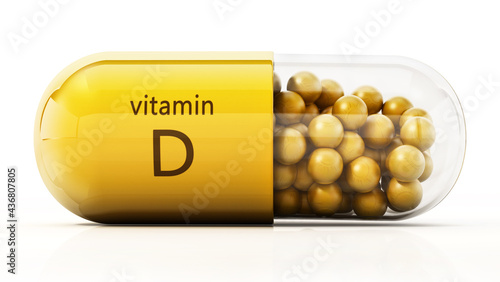 Vitamin D pill with yellow spheres with sun symbol. 3D illustration
