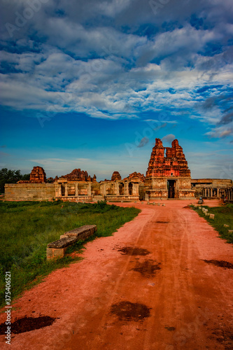 vithala temple with leading red soil road and amazing blue sky at hampi ruins