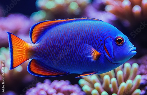 Vivid blue and orange tropical fish swimming near coral reef