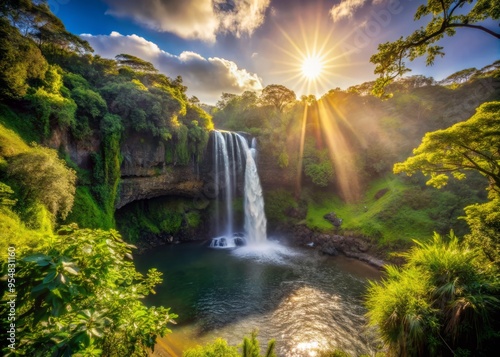Wailua Falls in the afternoon with the sun peeking through the trees, casting dappled shadows on the river below.