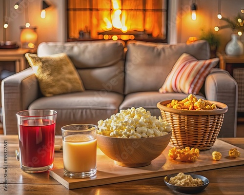 Warm and inviting living room scene featuring a bowl of freshly popped popcorn, assorted snacks, and refreshing drinks on a cozy couch side table.