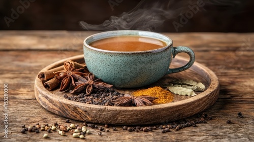 Warm Aromatic Beverage with Spices in Rustic Setting on Wooden Surface