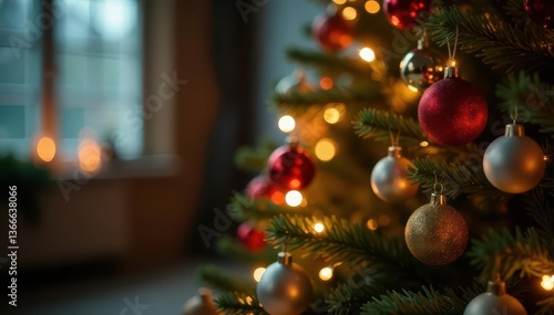 Warm golden glow, blurred Christmas tree lights & decorations, berries, ivy