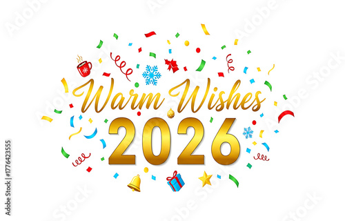 Warm Wishes for 2026 with festive confetti and holiday elements