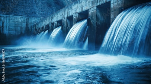 Water flowing from a dam into a river. The dam concept of hydroelectric power generation. The river concept of flowing water.