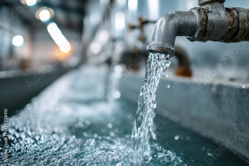 Water flowing from a metallic faucet into a reservoir showcasing industrial process and water conservation with a shallow depth of field and blurred background